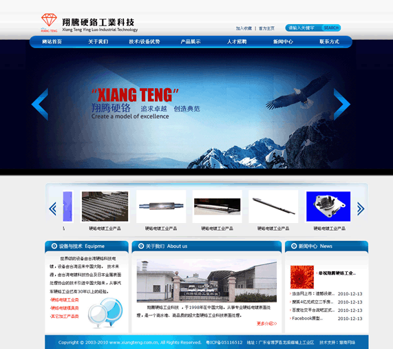 这是一家产品加工或电镀厂的网站制作方案与效果图,此网站以蓝色为主,导航下面为动画展示区,可以放公司的宣传产品也可以是文化之类的。如果公司有最新活动也可以放一些活动图片展示,动画下面是产品滚动的区域,无论您的公司是加工厂还是电镀厂,这里都可以不变。
