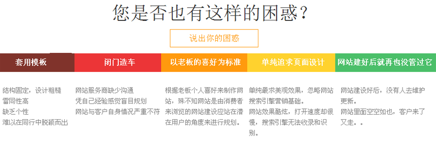 这是我们最常的一些网站问题,造成这样的原因有很多,也话您选的是低档次的网站,比如模版网站、CMS站,或是做网站的人不懂得网络营销、一个好的网站如果不经过专业的策划,做出来的效果肯定不理想,市面上各种网站的价位都有,几百元是个网站,几千元甚至几万元也是一个网站。这其中的区别是很大的,试想您花几百元做个网站,谁又会花很多的心思来策划与制作,大多都是随便找个模版往上面一套,随便添加的文章放里面就了事。